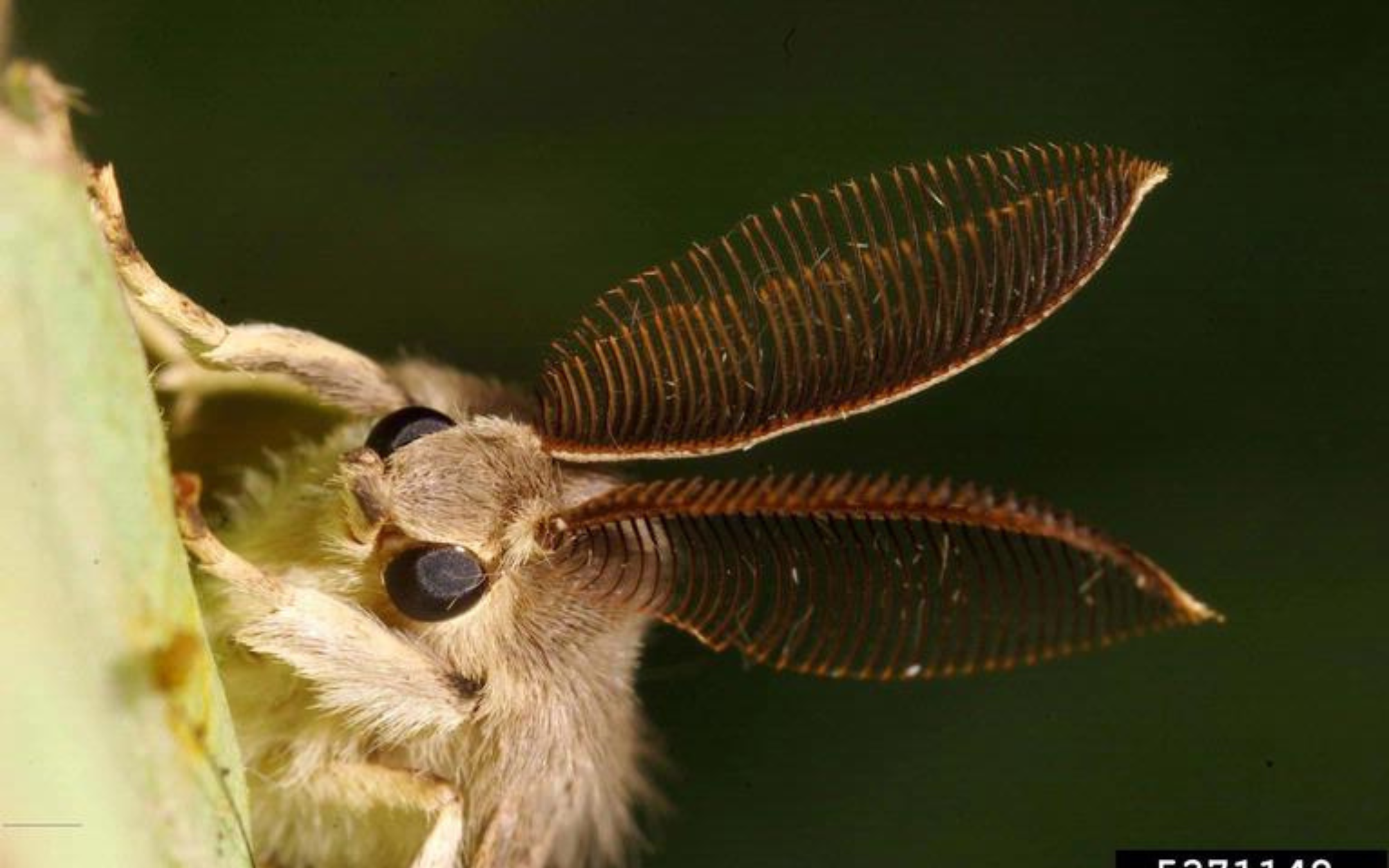 The appearance of spongy moths varies depending on their sex. Female moths are creamy-white with a 55 – 70 mm wingspan. Male moths are light to dark brown and much smaller than females, with a wingspan of 37 – 40 mm. Both sexes have pectinate antennae (which means their antennae look like a comb) and crescent-shaped markings on the front of their wings.