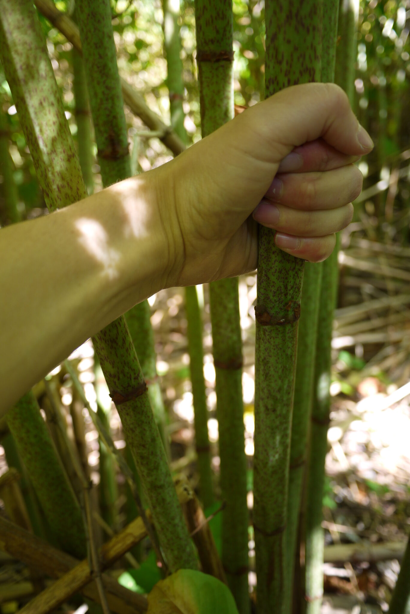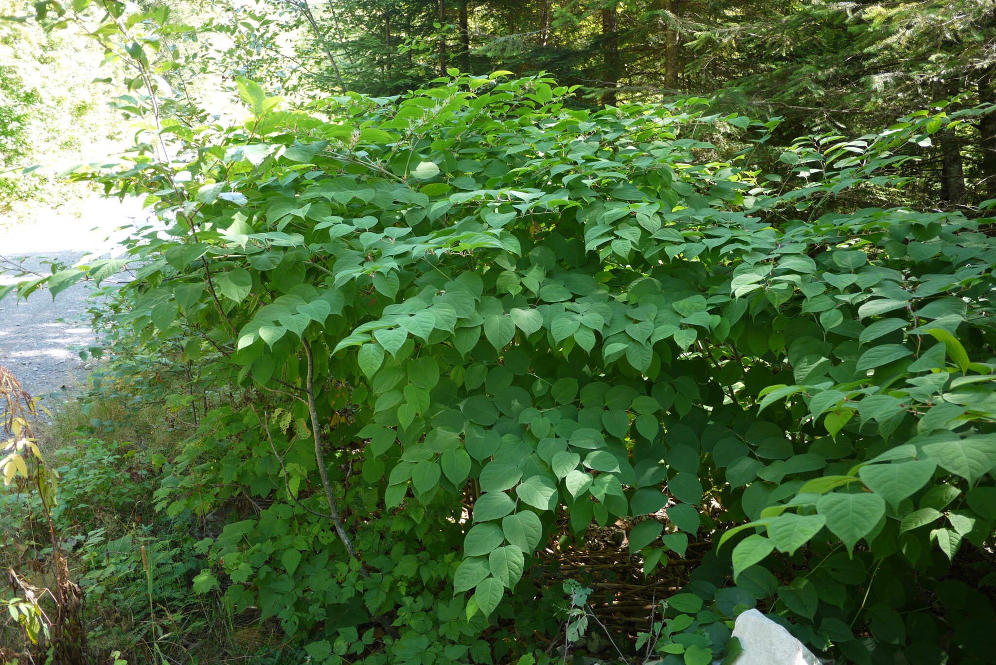 Japanese knotweed (Fallopia japonica) has thick, bamboo-like canes/stems that emerge from underground rhizomes. These canes form dense stands that crowd out native vegetation by shading and monopolizing resources.